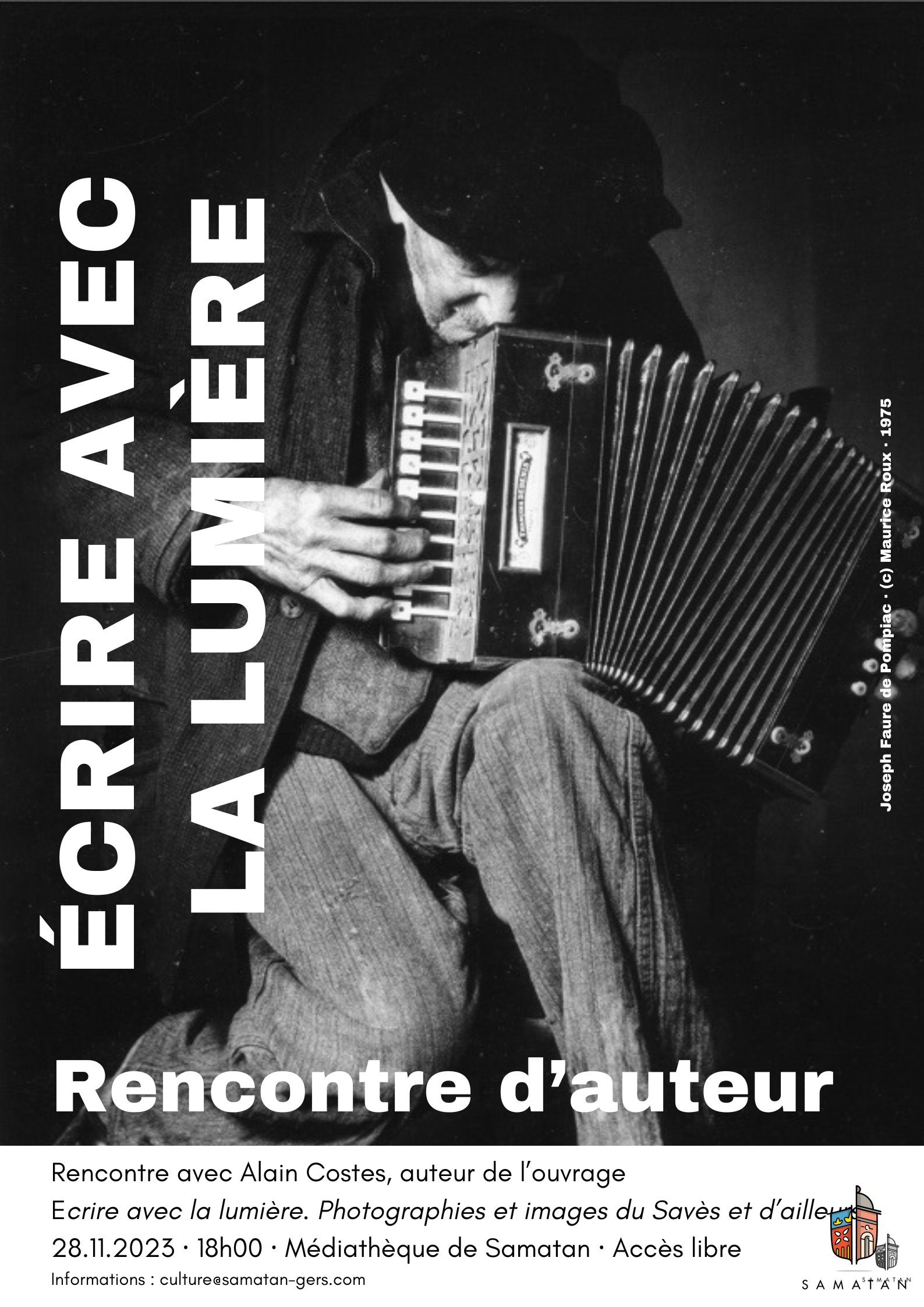 La médiathèque de Samatan organise une rencontre avec Alain Costes, auteur de l’ouvrage Ecrire avec la lumière. Photographies et images du Savès et d’ailleurs paru en 2023 aux éditions GRAM.